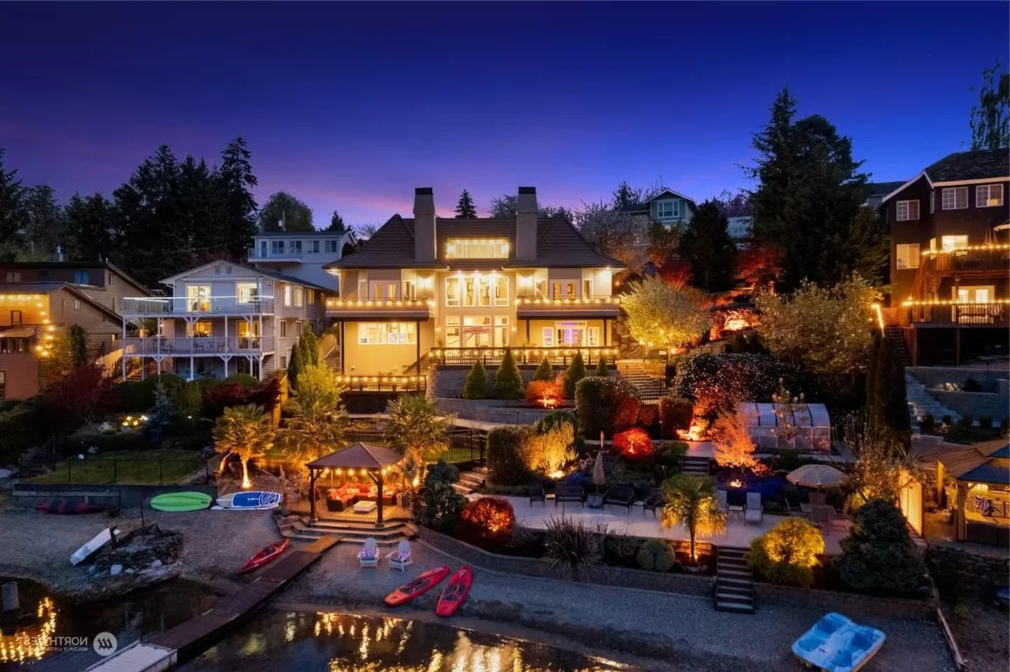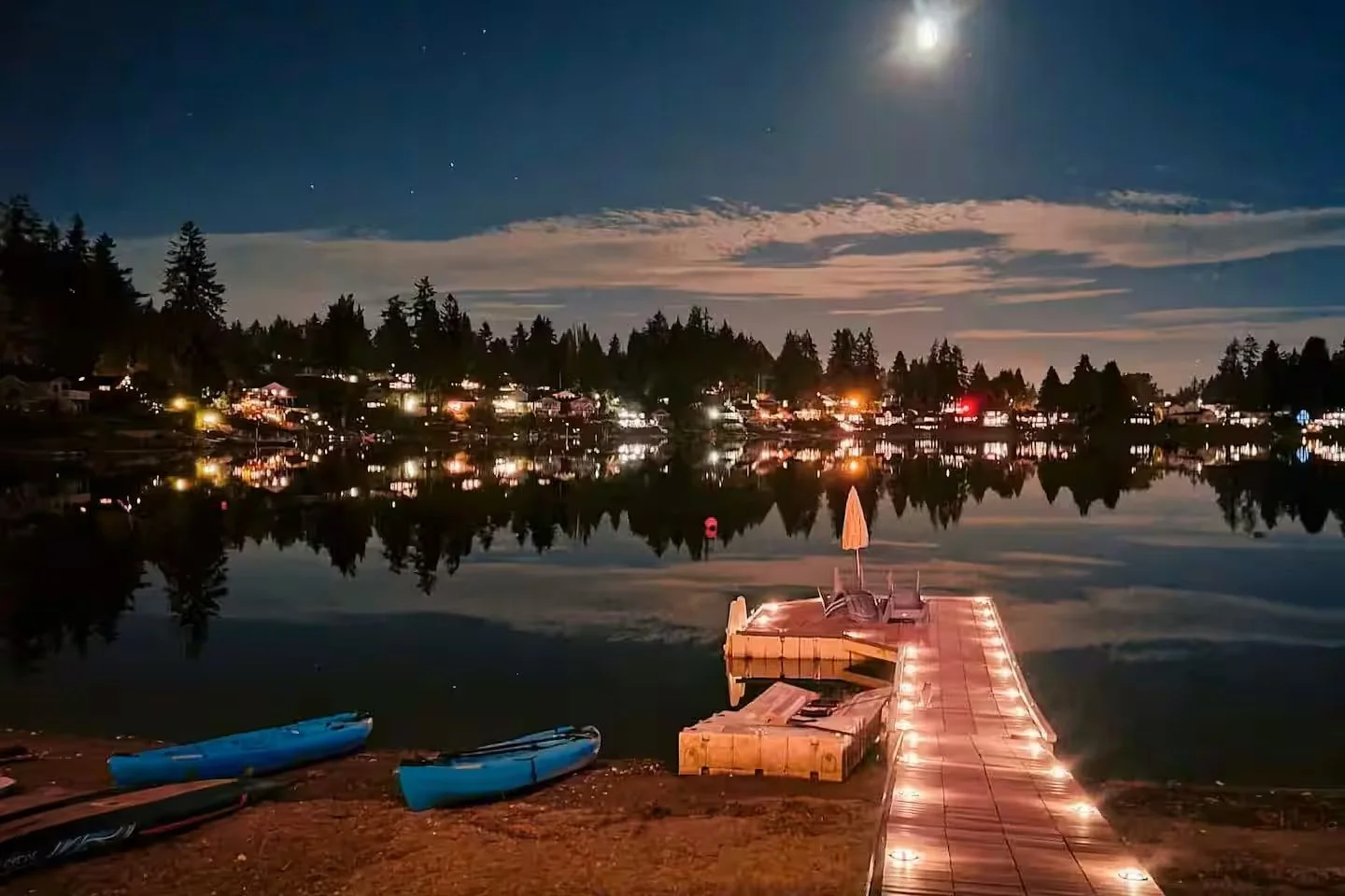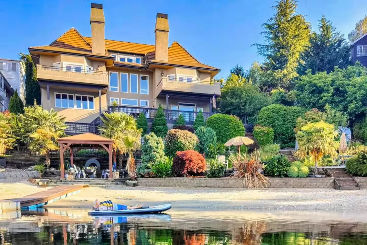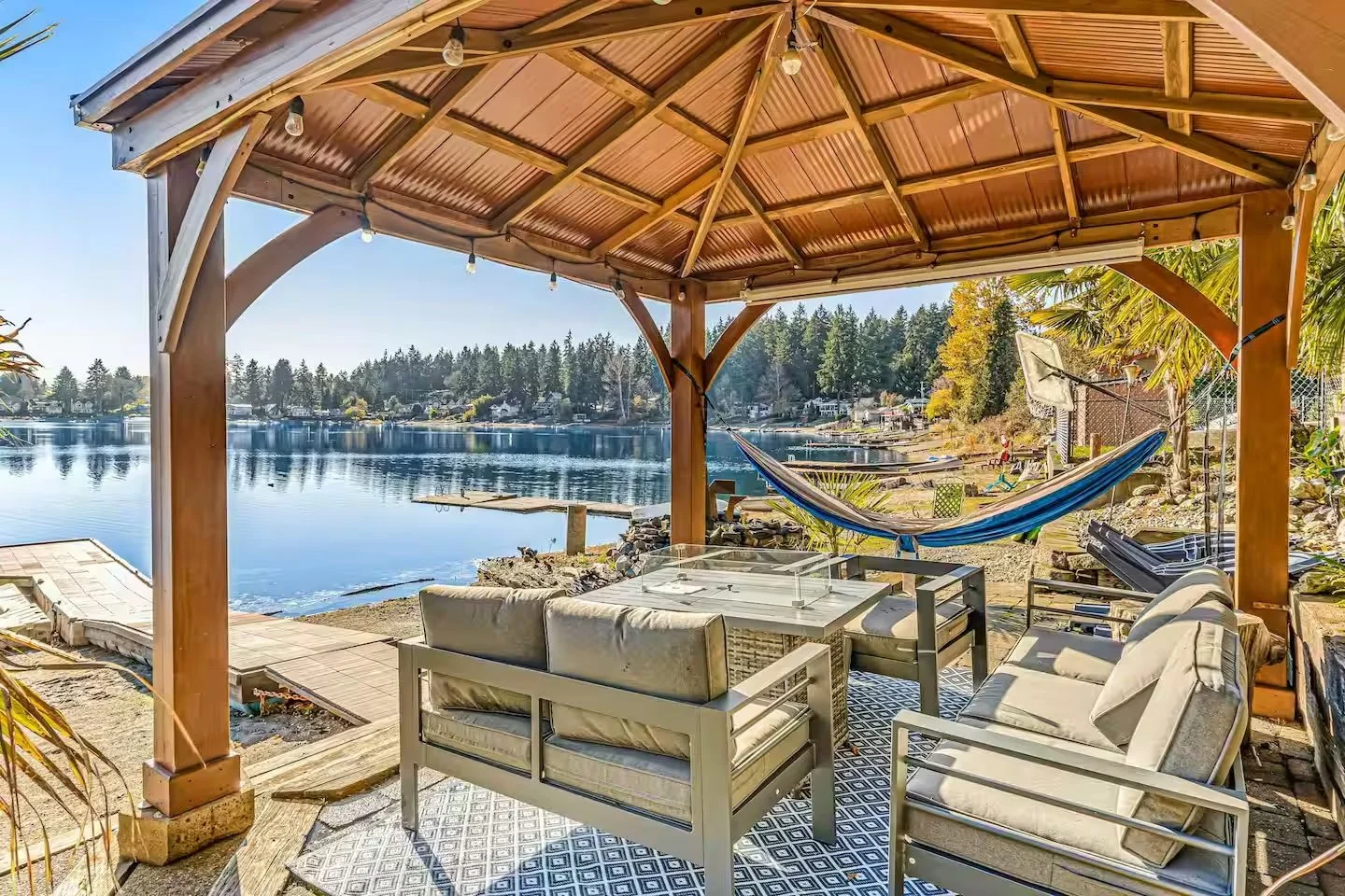 There’s private beach access with kayaks and paddleboards for easy, joyful time on the water, plus a hot tub, fire table, and plenty of outdoor space for lingering conversations under the sky.